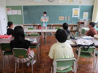 本校には、日南市立図書館より、たいよう号が2週間に1回来校します。図書館は①無料で利用できる ②こどもも利用できる ③読みたい本を貸してくれる ④調べ物をしたいときなどに、どんな本を読めばいいか教えてくれる等、たくさんの利点もお話していただきました。