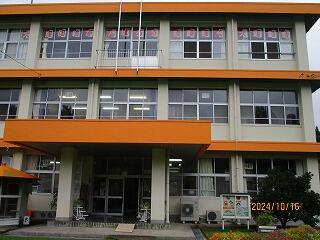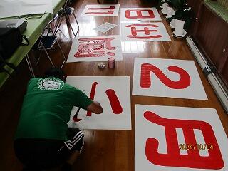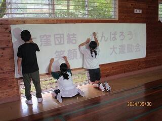 先週、校長先生は運動会のスローガン作成に取りかかっており、1人で黙々と作業をされていました。昨日の結団式の後、校舎3階の窓に貼り完成しました。来校される際は、是非力作をご覧ください。