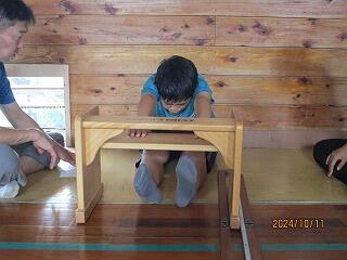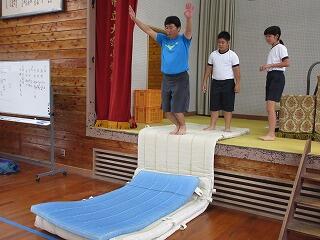 今日は、2時間たっぷり使い、マット運動で柔軟体操をした後、前回よりも少し難しい技のサーキットに挑戦していました。最後にトランポリンで「膝落ちして立ち上がる」「尻落ちして立ち上がる」「四つばいから立ち上がる」の技を教えていただきました。