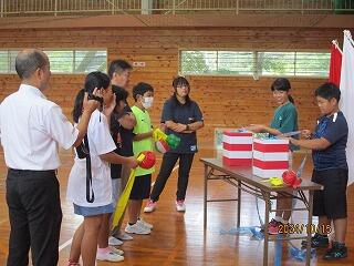 団旗授与では、赤と白のストライプのTシャツを着た校長先生が、各団長に団旗を授与されました。