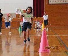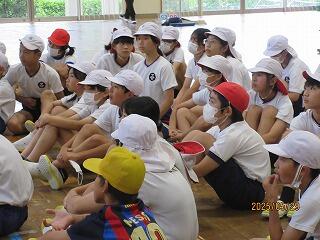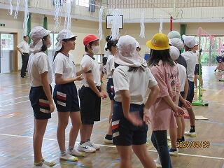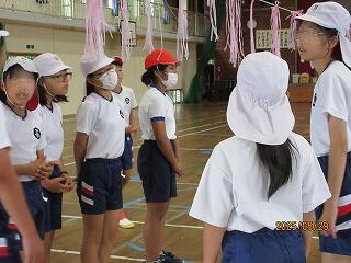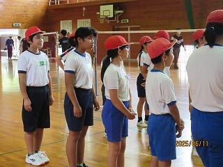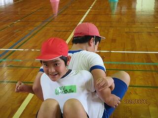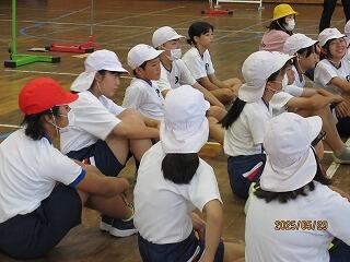 各学校の5・6年生と一緒に、体育の時間、グループに分かれてレクレーションをしたり、