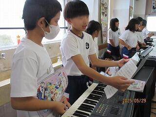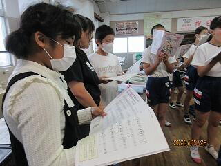 1時間目は音楽の授業で「ぼくらの日々」の合唱と「八木節」の合奏をしました。八木節は、去年、日南市音楽大会で合奏した曲です。今回、初めて大人数での合奏だったので「去年、合奏した曲を大人数でできてよかったです」と話していました。