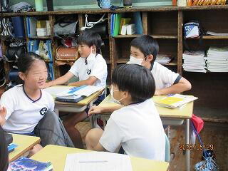 2時間目は国語の授業でした。それぞれの席に座り、漢文の音読と暗唱をして、グループ学習をおこないました。2人は違うグループでしたが、いつもと違う雰囲気での学習を楽しめてうれしかったようです。