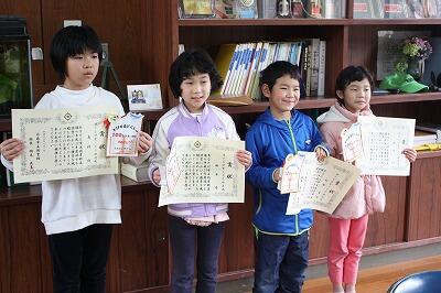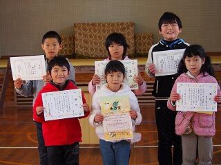 12月13日(木)に持久走大会を行いました。当初予定していた日が雨のため延期になっていました。これまで、体育の授業や業間の時間、または朝の時間等に、運動場で練習してきた成果を発揮しました。走った全員が、一週間前に計測したタイムを縮めることができました。保護者や地域の方の応援のおかげもありますが、本当によく頑張りました。最後は、校長先生から一人ずつ記録証をいただきました。