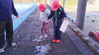 1月12日(金)、朝から子どもたちの歓声が上がりました。運動場は真っ白、霜柱があちこちにできていました。校門掲示板のガラス窓に氷の結晶を見つけては、「きれい!」。プールの水が凍っているのを見つけては、先生たちに報告をしていました。
