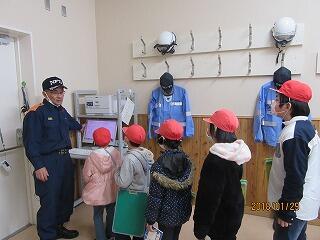 1月29日(月)、全校児童で消防署を見学しました。3・4年生の社会科学習の内容ですが、先日の避難訓練と関連した活動として計画しました。子どもたちも先生方も新しい消防署になって初めて訪れるとあって、わくわくしながら学校を出発しました。