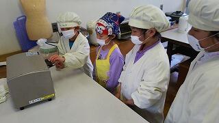 次に、福江さんから給食についてお話をしていただきました。低学年の背丈ほどもある大きなしゃもじ”スパテラ”という道具などを使って、約3000名分の給食を毎日作っていらっしゃることを伺って、みんなびっくりしました。大量の食材の処理は、機械も使うようですが手作業も多く、大変だなあと改めて思いました。