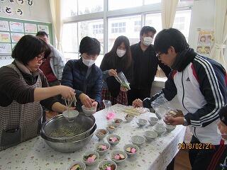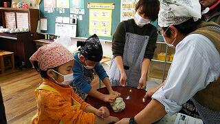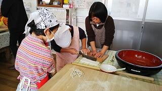 その後、第7回家庭教育学級で「そば打ち体験」を実施しました。講師に、道の駅酒谷から山口さんと谷口さんをお招きしました。子どもたちにとっては初めての体験でしたが、お父さんお母さん方と協力して、おいしい、おいしい十割そばができました。