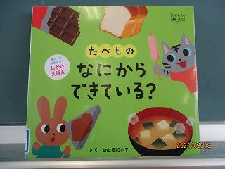 「たべもの なにからできている」という絵本です。ソフトクリーム、パン、せんべい、ソーセージなど身近な食べ物が何からできているかを子ども達に問いかけながら読まれていました。仕掛け絵本にもなっており、見ていて楽しく、食育にもつながる内容でした。先日、遠足で炊飯活動を行ったことから、「お米」に関する本の紹介もありました。