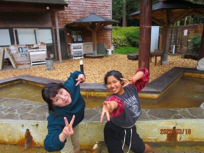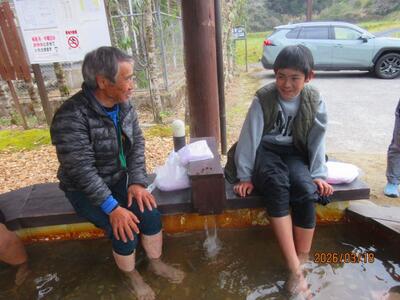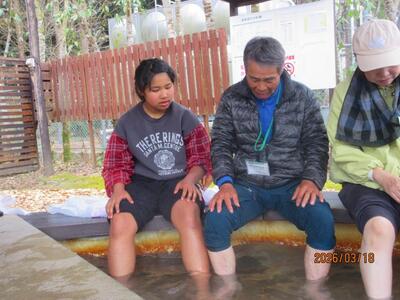 足湯にも行きました。小雨が降り、少し肌寒かったのでとても気持ちよく、リラックスできたようです。