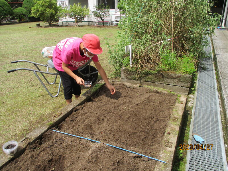 4月18日、5年生は自分達で育てたインゲン豆を植えるため花壇の整備をしました。