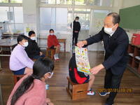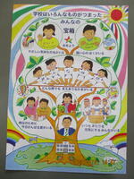 教頭先生からのお話では、宮崎市内在住の星野和寅さんが学校にプレゼントしてくださった、手作りポスターの紹介がありました。一緒に添えられた手紙には「登校する子ども達の声に元気をもらっている」という一文があり、子ども達は地域の方々へ元気よく挨拶することの大切さを改めて感じたようです。