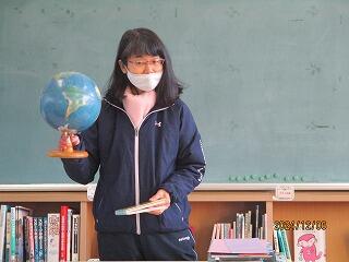 読み聞かせは、多田先生が中学1年生の頃、国語の本に掲載されていた谷川俊太郎 詩「朝のリレー」でした。この詩の中には、カムチャッカ、メキシコ、ニューヨーク、ローマの4つの地名が出てきます。自分達が朝を迎えた後に、遠くの国の人々が同じように朝を迎える。まるで「朝のリレー」のように。そして、時差はあるが同じ地球に住む者として仲良く地球を守っていきましょうという内容でした。