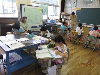 国語の授業の様子です。複式学級なので、学年別に背中合わせで学習をしています。