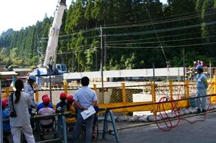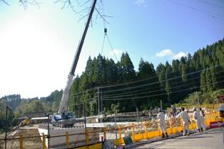 12月に完成予定を予定している校門前の仮屋橋架け替え工事が大詰めを迎えています。今日は「橋桁」の設置が行われ、その様子を見学しました。桁の長さは20メートルで、大牟田の工場から一晩かけてトレーラーで運ばれてきました。それを巨大なレーンで引き上げ1本1本設置していました。工事の関係者の皆様から詳しい説明をいただきながらの見学で、とても貴重な体験となりました。