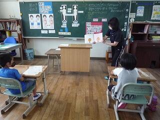日南警察署の方をお迎えして、不審者対応の避難訓練を行いました。日頃から大きな声であいさつをすること、防犯ブザーを鳴らす練習をすること、不審者にあったら特徴をつかんで保護者へすぐ連絡すること等を学習しました。
