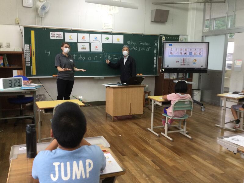 毎回、飫肥小学校から来てくださる英語専科の木村先生とALTのアビゲ先生が優しく英語を教えてくださるので、みんな楽しく学んでいます。