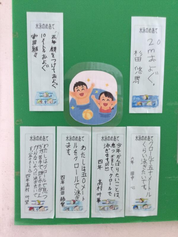 ひとりひとり、今年の水泳の授業で何かできるようになりたいか目標をたてて毎時間練習に励んでいます。7月11日の記録会で、練習の成果を発表しますので、ぜひ見に来てください。
