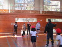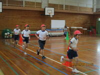 代わりに、保護者や地域の皆様に見守られる中、体力づくりタイムを実施しました。子ども達は、音楽に合わせてスキップやほふく前進などを行い、体を温めていました。
