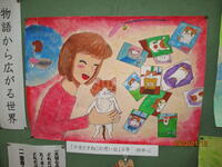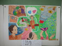 6年生の読書感想画です。高学年らしく、色の濃淡を上手に使い分けて表現しています。また、1枚の画用紙に様々な場面が描かれており、登場人物の感情の変化を読み取ることができます。