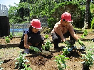 3校時に「花の苗植え」を行いました。JA、青年部の方々が6名来校され、子ども達に花の名前や植え方などを教えていただきました。マリーゴールド、ブルーサルビア、メランポジウム、ユリウス、ルドベキアの5種類です。