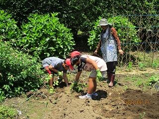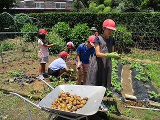 学校農園のじゃがいもが収穫時期となり、農園のお世話をしてくださっている田中さんと収穫しました。
