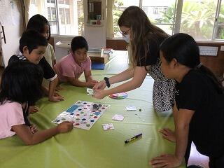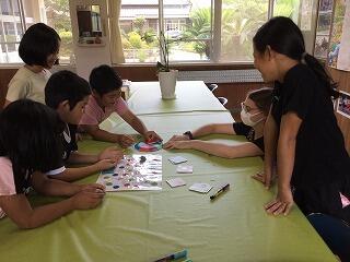 ALTのアビゲイル先生が子ども達にすごろくを作ってきてくださいました。アイデア満載のすごろくです。スタートが「Abby's house」、ゴールは先生の好きな「Hamazushi」。サイコロをふり進んでいくと、途中にカラフルなお皿と猫の絵があります。止まった皿や絵によってお題のカードも用意されていて、英語で受け答えをします。子ども達は拾ってきた小石にカラーペンで名前を書き、それを駒にして楽しそうに遊んでいます。さあ、だれが最初に「Hamazushi」に到達するでしょうか。アビゲイル先生、ありがとうござます。
