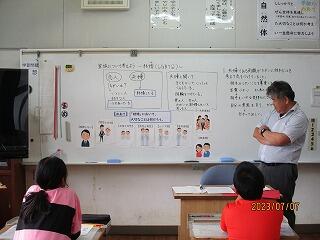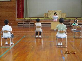 校長先生からのお話もありました。概要を紹介します。①みんなが目標にしている「あいさつ日本一の学校」をこれからも目指しましょう。②校長先生が呼びかけた作文の募集にみんなが「やりたいです!」と希望してくれて嬉しかったです。全員完成させることができました。これからも機会があったら、積極的に挑戦しましょう。③みんなの水泳学習を頑張る姿を見て感動しました。