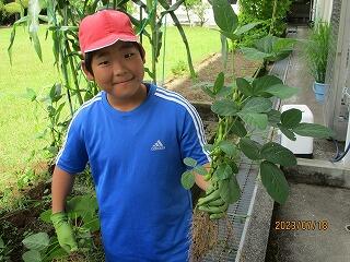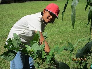 5年生は、花壇に植えた枝豆の収穫をしていました。太陽の光をたくさん浴びて育った野菜は、栄養素がたくさん詰まっています。オクラやトウモロコシの収穫も楽しみですね。