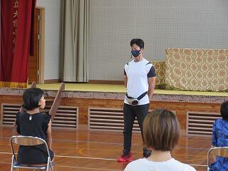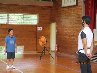 今日の3校時は剣棒踊りの練習でした。この踊りは6名で踊るのですが、全児童が5名のため、不足している1名分は先生達が交代で入ります。10月の運動会でも披露します。子ども達は、踊りは完璧に覚えているので、あとは動きの確認などを行っています。先生達は、子ども達から教えてもらったり、タブレットを見ながら覚えるのに必死です。