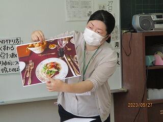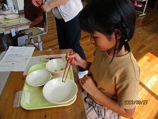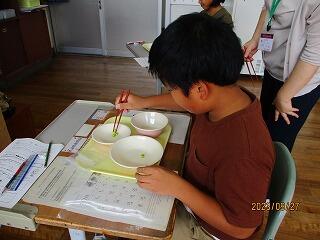その後も、おもちゃの豆で箸の使い方を練習をしたり、日本と外国の食事マナーの違いの話を聞いたりしました。そして最後に、修学旅行での食事のマナーをクイズ形式で教えてくださいました。ポイントは「みんなが気持ちよく食事ができるように」です。今日学んだことをしっかり身に付けましょうね。