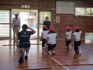 今日の3校時は剣棒踊りの練習でした。この踊りは6名で踊るのですが、全児童が5名のため、不足している1名分は先生達が交代で入ります。10月の運動会でも披露します。子ども達は、踊りは完璧に覚えているので、あとは動きの確認などを行っています。先生達は、子ども達から教えてもらったり、タブレットを見ながら覚えるのに必死です。