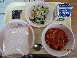 今日の給食は、細田小学校で学年に分かれ食べました。献立は「食パン、牛乳、牛肉のトマト煮、海藻サラダ、ソフトチョコ」でした。とてもおいしかったです。細田調理場のみなさんありがとうございました。