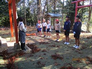 11月20日(月)の5~6校時に4校合同(大堂津小・大窪小・細田小・細田中)ボランティア活動が行われました。本校は、細田中学校2年生2名(本校卒業生)と一緒に大窪神社清掃を行いました。宮司さんから、神社に入るときの作法や神社の鈴を鳴らす理由などを教えていただいた後、全員で境内清掃をし、次に各々の清掃場所に取りかかりました。落雷で杉の木が2本枯れてしまった影響か、枯れた杉の葉が絨毯のように地面に落ちていました。清掃後は、見違えるほどきれいになり宮司さんにも喜んでいただきました。帰りに、日本の年中行事が書かれたクリアファイルをいただき、おみくじを引いて、すがすがしい気持ちで帰校しました。22日、23日に当神社で実施される例大祭で、地域の人もたくさん訪れられることでしょう。少しでもお役に立てて良かったです。