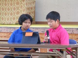 今朝の全校朝会は、まず9月に開催された「平和フェスティバル」の作品募集で、叶望さんと叶夢さんが応募した絵画が紹介されました。二人が作品に込めた思いを話してくれました。