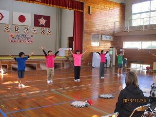 まずは、毎年恒例のグランドゴルフ大会から始まりました。中庭や運動場にコースを作り、児童・保護者・職員・地域の方々と一緒に楽しみました。その後、体育館へ移動し、学習発表会を実施しました。最初に、「ゆかいに歩けば」「ハロー・シャイニングブルー」の合唱。次に、総合的な学習の時間の発表(美々鯵の魅力体験について)を行いました。最後は、リズムダンス「夜に駆ける」「YMCA」を披露しました。