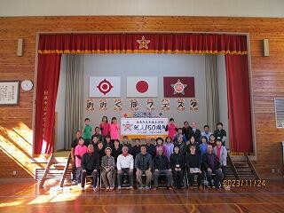 続いて、創立150周年行事が行われました。自治会長さん達の協力をいただき、記念看板の披露をしました。オレンジ色は、みかんの里大窪をイメージしたものです。50年前の創立100周年時の写真も展示してあり、懐かしそうに見いる方もおられました。最後に参加者全員と記念撮影を行い、記念品を配付し閉会しました。いつか、この写真を見ながら「あの頃は・・・」と語り合う日が来ることでしょう。