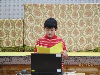 始業式では、悠馬さんが新年度に向けて3つの目標を発表しました。「国語で文章をスラスラ読めるように、トレーニングを頑張る。」「水泳で50M泳ぐために、バタ足や息継ぎの練習を頑張る。」「相手の話をよく聞き、正しい受け答えをする。」1年後には、達成できるといいですね。