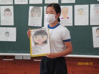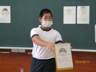 学級活動の題材は、「仲良くなろう」でした。9月に実施される合同宿泊学習も同じメンバーで行動をするため、みんなの名前と顔を覚えてもらうのが目的です。1人ずつ似顔絵+好きな食べ物、好きなスポーツなどを書いたプロフィール表を作成し、それが誰のものなのかを当てるゲームをしました。