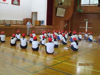 2校時に避難訓練(不審者対応)が行われました。不審者が玄関から侵入した場面を想定し、状況を的確に判断し、子ども達を安全に避難させました。その後、校長先生より、23年前に不審者が侵入し死者・負傷者がでた大阪教育大学附属池田小学校の話や、その学校で行われている避難訓練の様子を動画で見ました。本校も対策を行っていますが、学校外は危険が潜んでいます。まずは、1人で行動せず、誰かと行動をしてください。もし、知らない人に声を掛けられた場合は「走って逃げる」「大声で助けを呼ぶ」「近所の家に助けを求める」ことで、不審者から逃げてください。