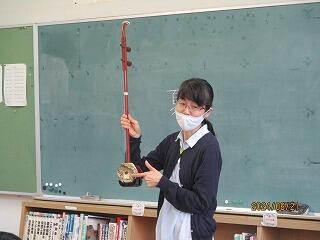 この本の中で、ヤギの皮で作った太鼓が出てきました。動物で作った楽器はいくつかありますが、今回多田先生は蛇の皮から出来ている二胡を見せてくれました。