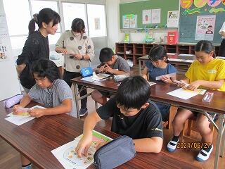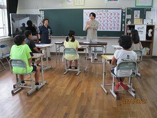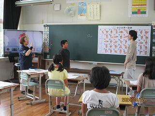 講師は、日南手話サークルたんぽぽより海老原様と久永様が来校され、子ども達に分かりやすくお話をしてくださいました。まず、聴覚障害の説明や聴覚障害者とのコミュニケーションの一つに手話があることを教わりました。大事なことは「手話は、見て分かる大切なことば」です。手話であいさつをしたり、指文字を使って自己紹介をしたり、最後はトトロのさんぽの音楽に合わせながら手話をしました。