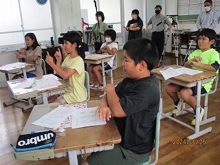 昨日の5校時は、栄養教諭による「食の指導」でした。本校担当は、今年度より油津小学校の宮田栄養教諭になりました。9月に宿泊学習が行われるため、食事のマナーを教えていただきました。