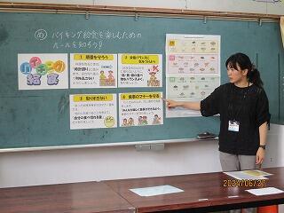 バイキングのマナーとして、①順番を守る ②栄養バランスに気を付ける ③他の人のことも考え、食べきれる量をとる ④食事のマナーを守る(口に食べ物が入ったまま話さない、走り回らない、食べる姿勢に気を付ける)ことを、一つ一つ説明してくださいました。その後、再度模擬バイキングに挑戦したところ、栄養バランスに気を付けながら選んでいました。子ども達も楽しく学習することができました。最後に、宿泊学習中の食事で気を付けたいことを一人ひとり発表しました。