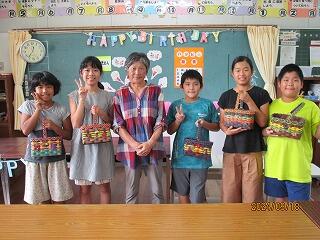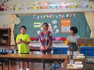 今日は、いつもお世話になっている田中さんのミニ誕生会を行いました。田中さんは、ボランティアで毎朝子ども達の登校の見守りや、学校農園にたくさんの野菜を作ってくださるなど、何かとお世話になっている方です。みんなからのメッセージカードをプレゼントし、一緒に楽しく給食を食べました。田中さんからも、サプライズで子ども達へクラフトテープで製作したバッグと手作りストラップ、職員にも手作りストラップと肩たたき棒のプレゼントをいただきました。本当にありがとうございました。