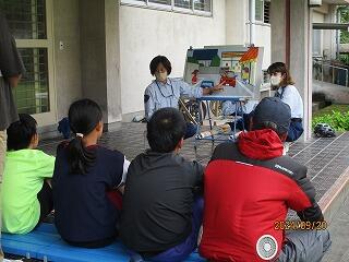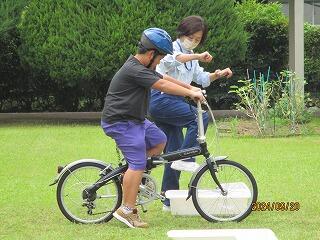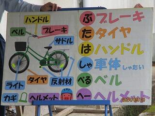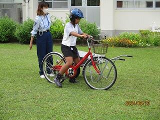 雨のため運動場が使用出来なく、中庭と体育館で行いました。歩道がある時、歩道が無いときの歩行の仕方、交差点で信号を待つときの注意点などの説明がありました。次に、自転車の点検を行い、実際に自転車に乗り、道路の横断や道路に車が停まっている場合の通り方、体育館では横断歩道の渡り方を教わりました。