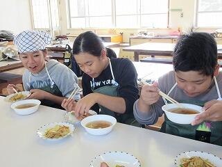 6年生は、1~3校時の家庭科の時間に調理実習を行いました。9~10月に製作したお揃いのエプロンを身に付けていました今日は「野菜のベーコン巻き」「ジャーマンポテト」「コンソメスープ」の3品です。今回は、1人1品ずつ作っていました。各々ノートにまとめた調理工程を確認しながら、野菜を切ったり、材料を茹でたり、炒めたりしながら完成させました。彩りもきれいで、味付けも美味しく3人とも満足げな様子でした