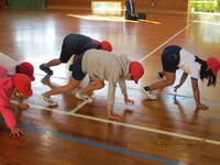 代わりに、保護者や地域の皆様に見守られる中、体力づくりタイムを実施しました。子ども達は、音楽に合わせてスキップやほふく前進などを行い、体を温めていました。