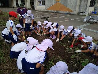 先日の昼休みに4年生が花壇の整備をしていました。