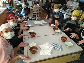 できあがったご飯とみそ汁をおいしそうに食べていました。
